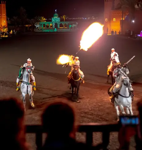 During your meal, the show comes alive: belly dancers, folk music, acrobats and the unforgettable Fantasia, where horsemen gallop at full speed in their traditional attire. Fireworks, an enchanting atmosphere, stories of an ancestral culture all leading to a truly unique evening.